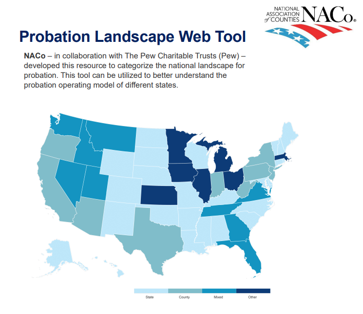 In recognition of the critical role county governments play in public safety and the administration of justice, the National Association of Counties (NACo) has released the Probation Landscape Web Tool. The web tool provides an overview of the probation operation of each state. The tool is categorized into four types of operating policy: state, county, mixed and other. Listed within each category are the states that fall under each operating policy, along with a summary of the community supervision operations for each state. Counties can leverage this information to identify the similarities and differences across various probation systems. Access the tool here.
