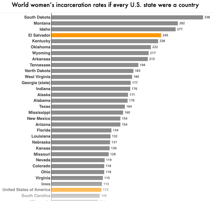 This morning, the Prison Policy Initiative published a new report calculating the incarceration rates of women in every U.S. state in 2025 and comparing states to the rest of the world. Our main finding likely won't come as a surprise: Every U.S. state incarcerates more women per capita than most independent nations, and is far out of line with the countries the U.S. considers its peers.